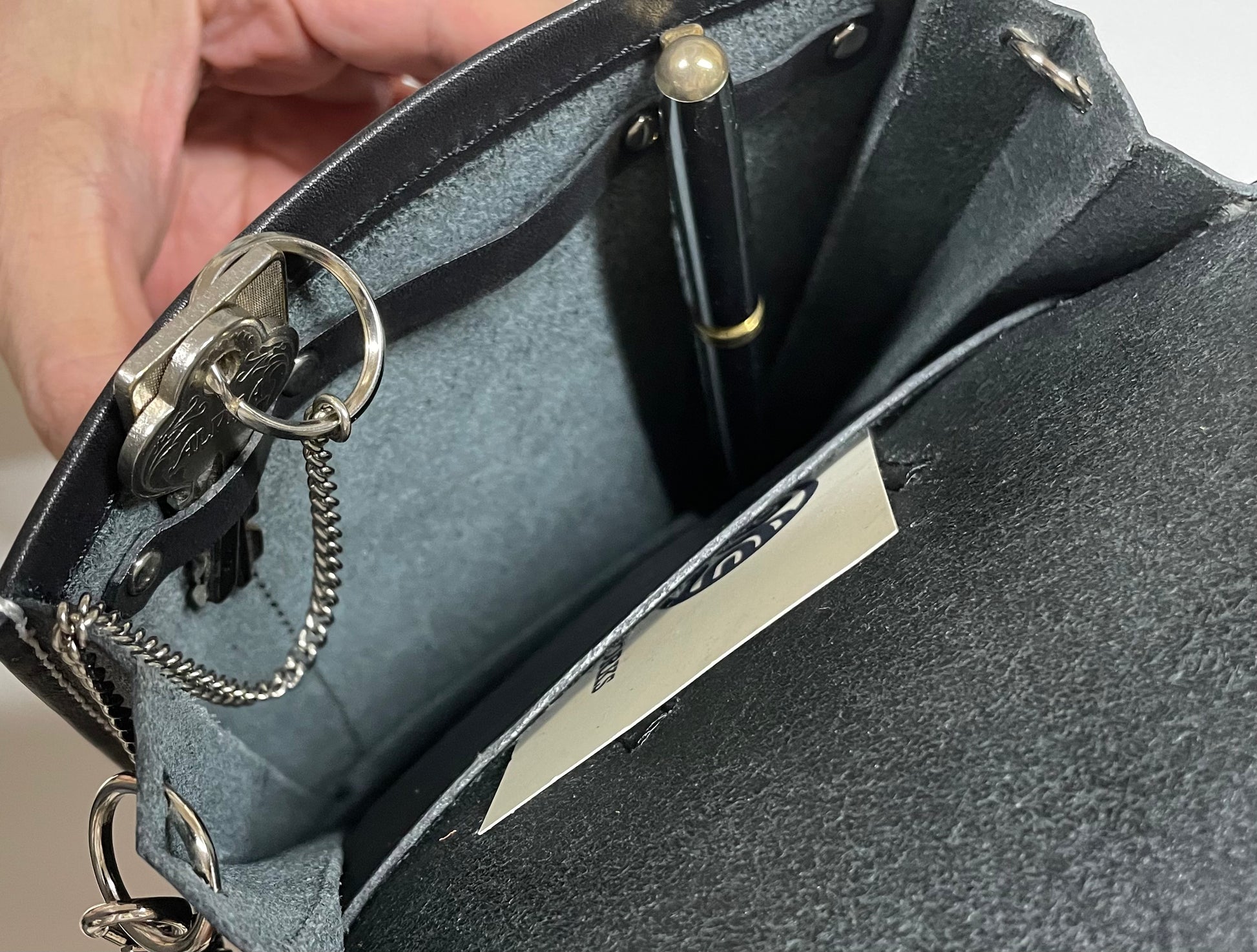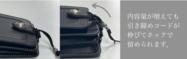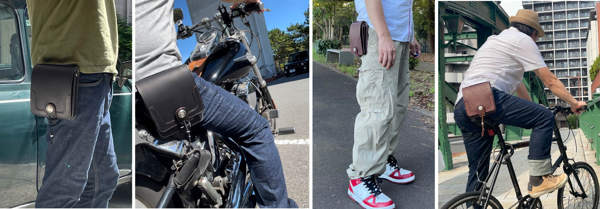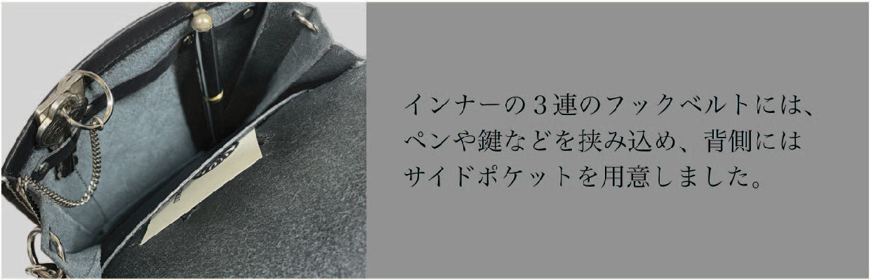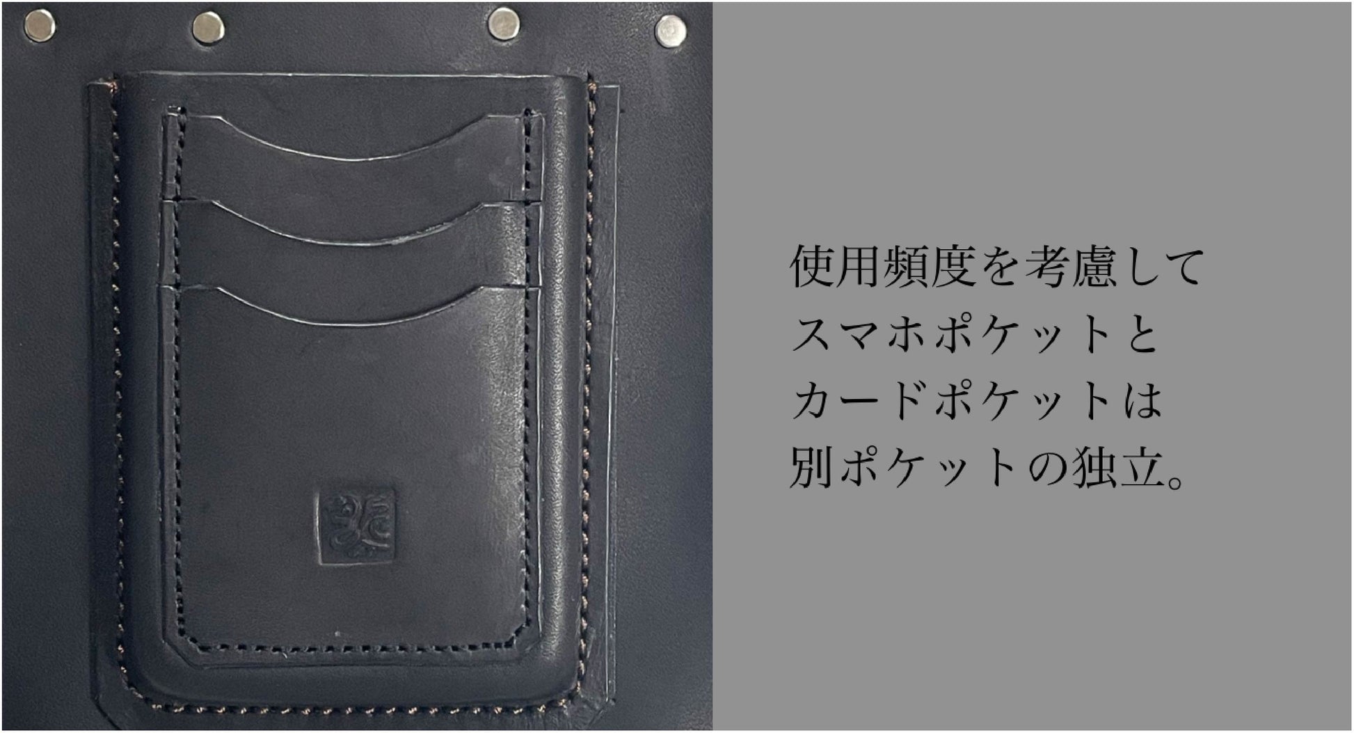 専用のスマホポケット、カードポケットを装備。メインポケットはハーフウォレットや、メガネ、タバコなどの携帯に活躍。内容量に応じてホックの留め位置がフレキシブルになる新方式の留め具を開発しました。
