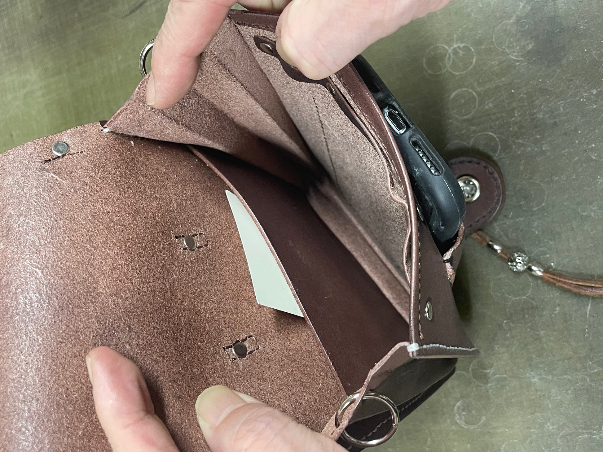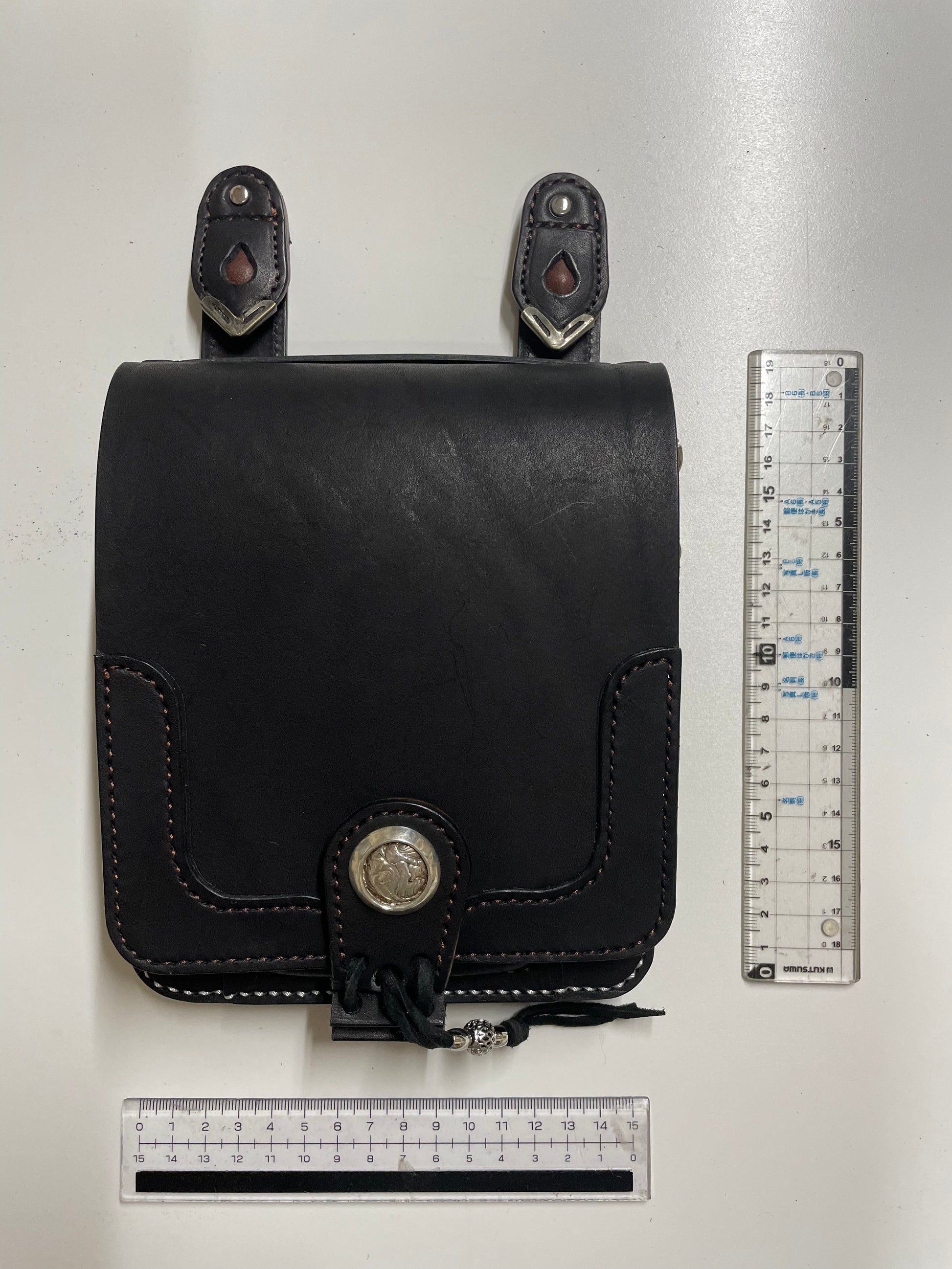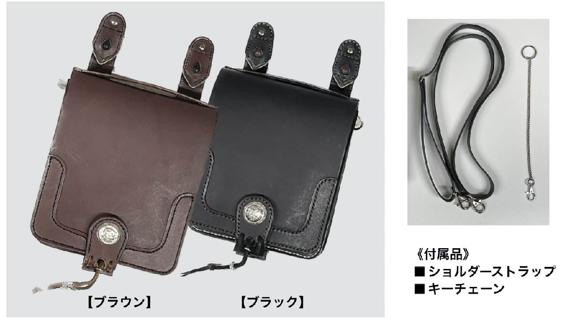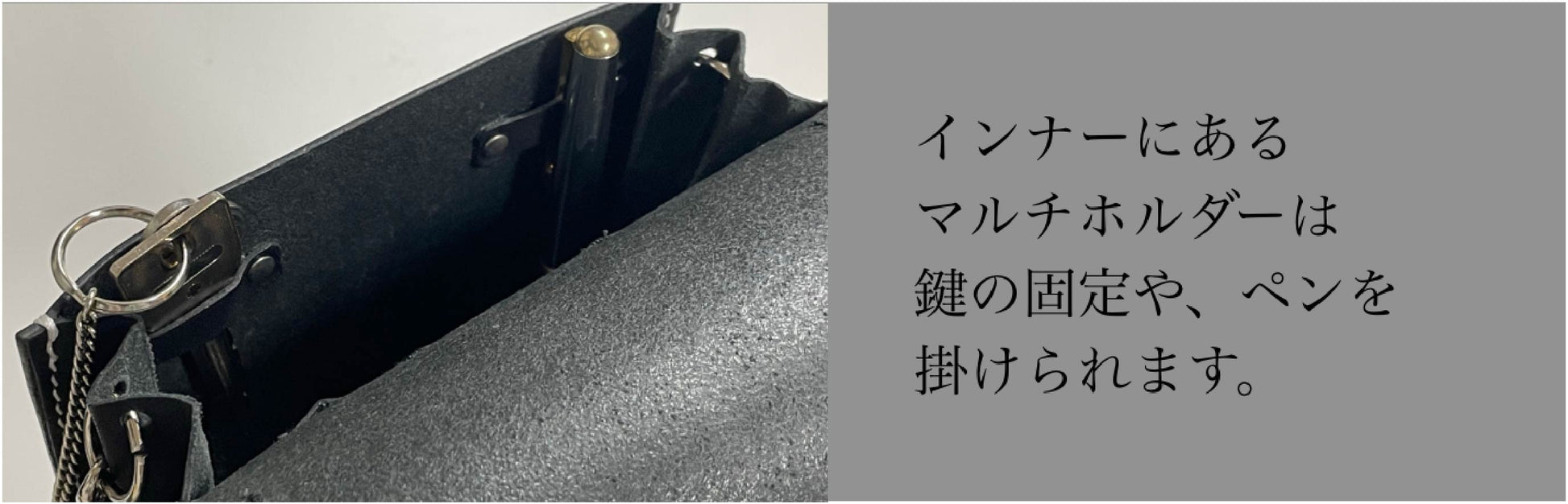 専用のスマホポケット、カードポケットを装備。メインポケットはハーフウォレットや、メガネ、タバコなどの携帯に活躍。内容量に応じてホックの留め位置がフレキシブルになる新方式の留め具を開発しました。