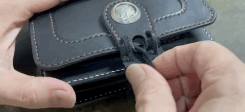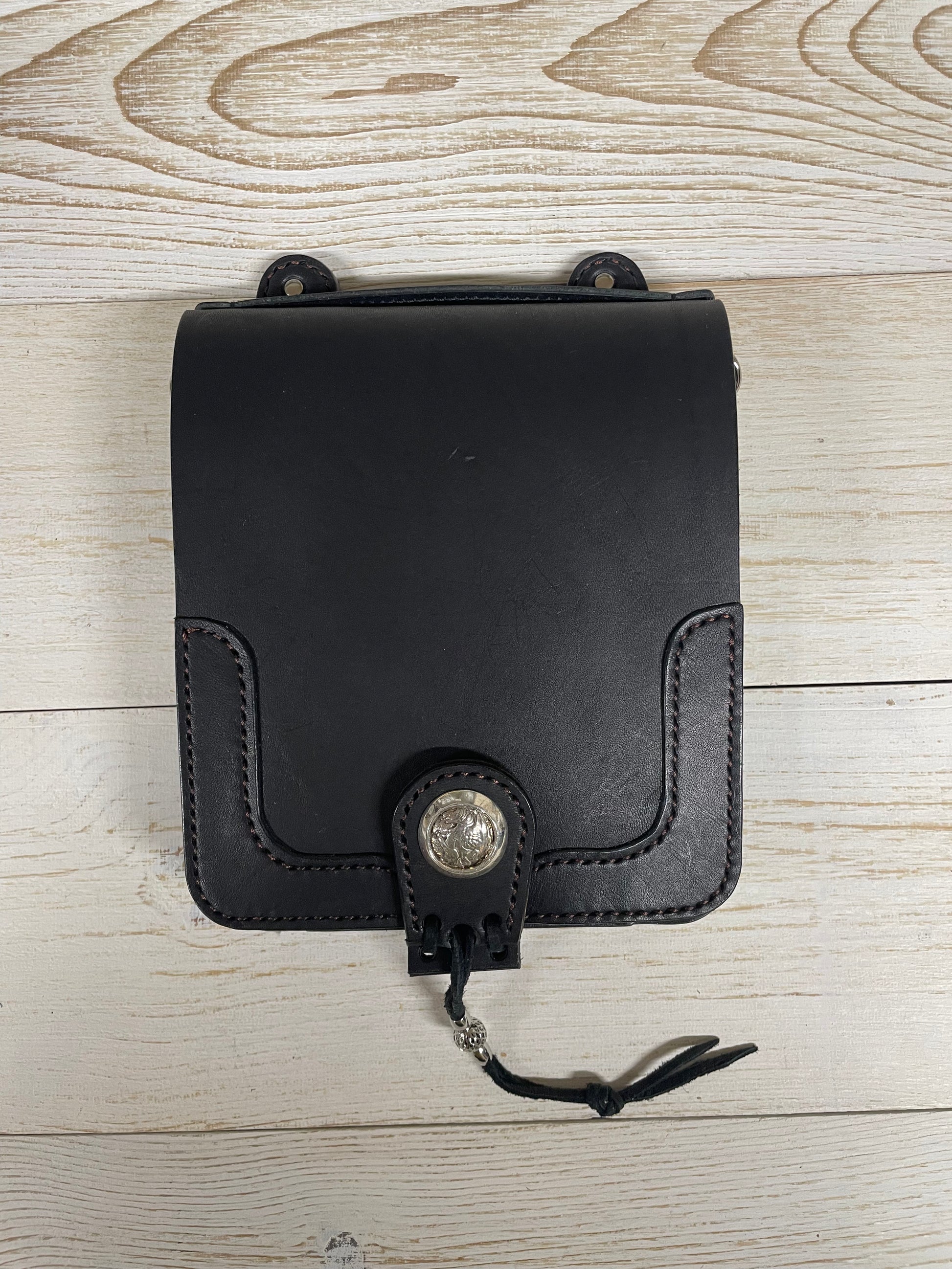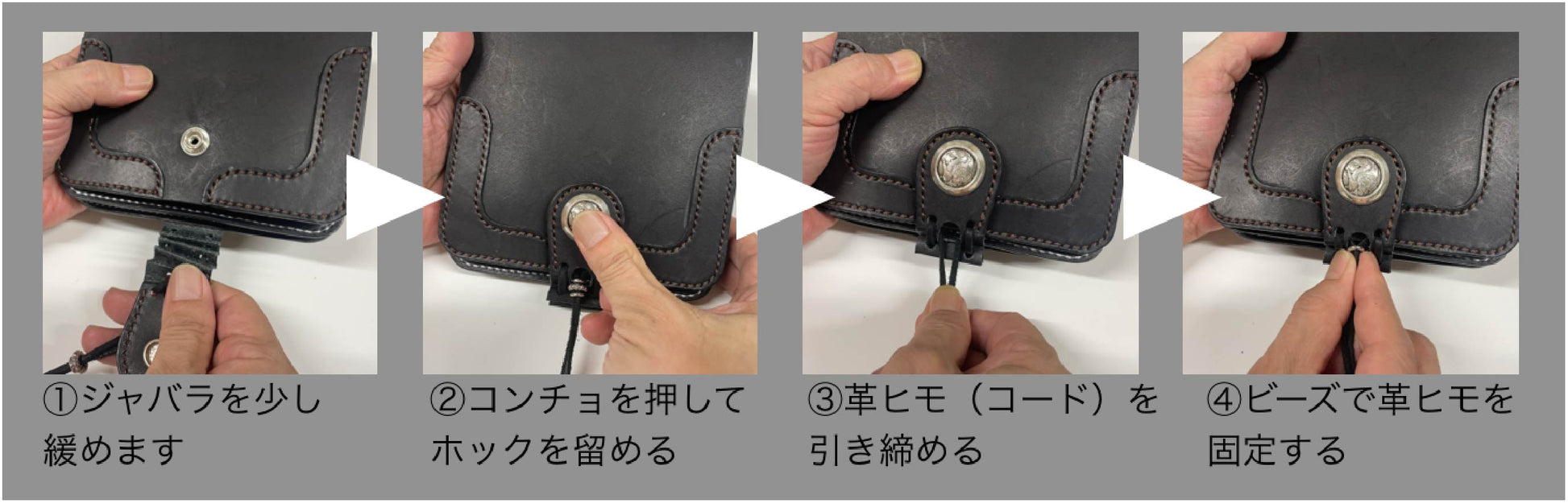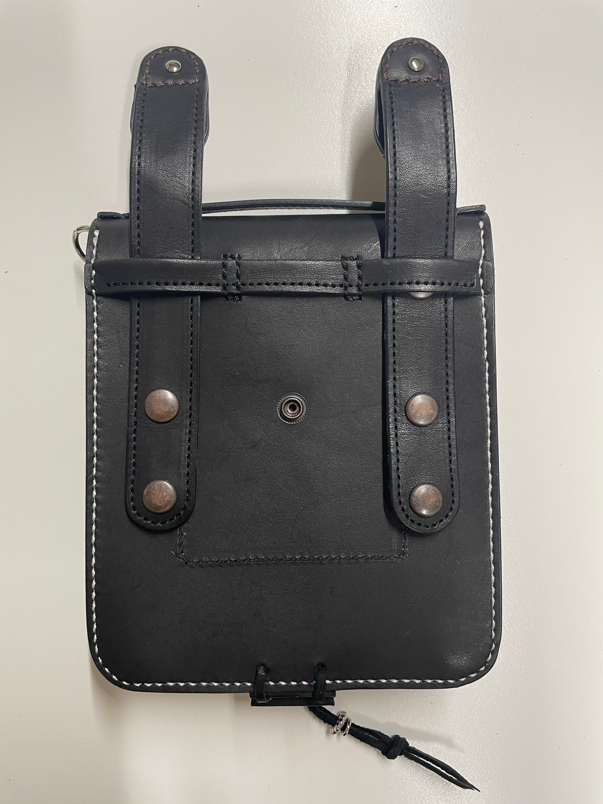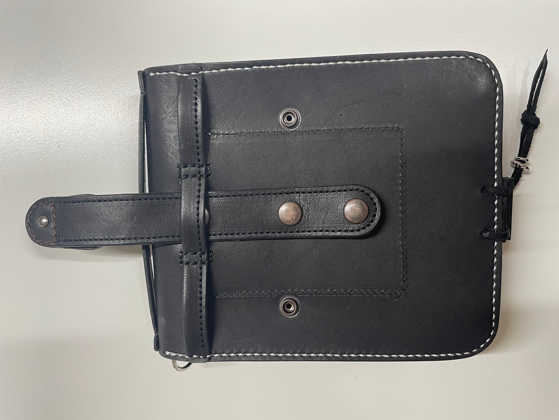 専用のスマホポケット、カードポケットを装備。メインポケットはハーフウォレットや、メガネ、タバコなどの携帯に活躍。内容量に応じてホックの留め位置がフレキシブルになる新方式の留め具を開発しました。