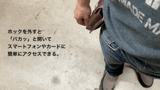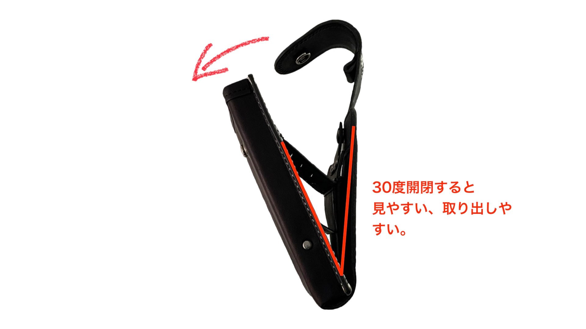本体が外側に約30度倒れて開くのでスマホが簡単い取り出せます。