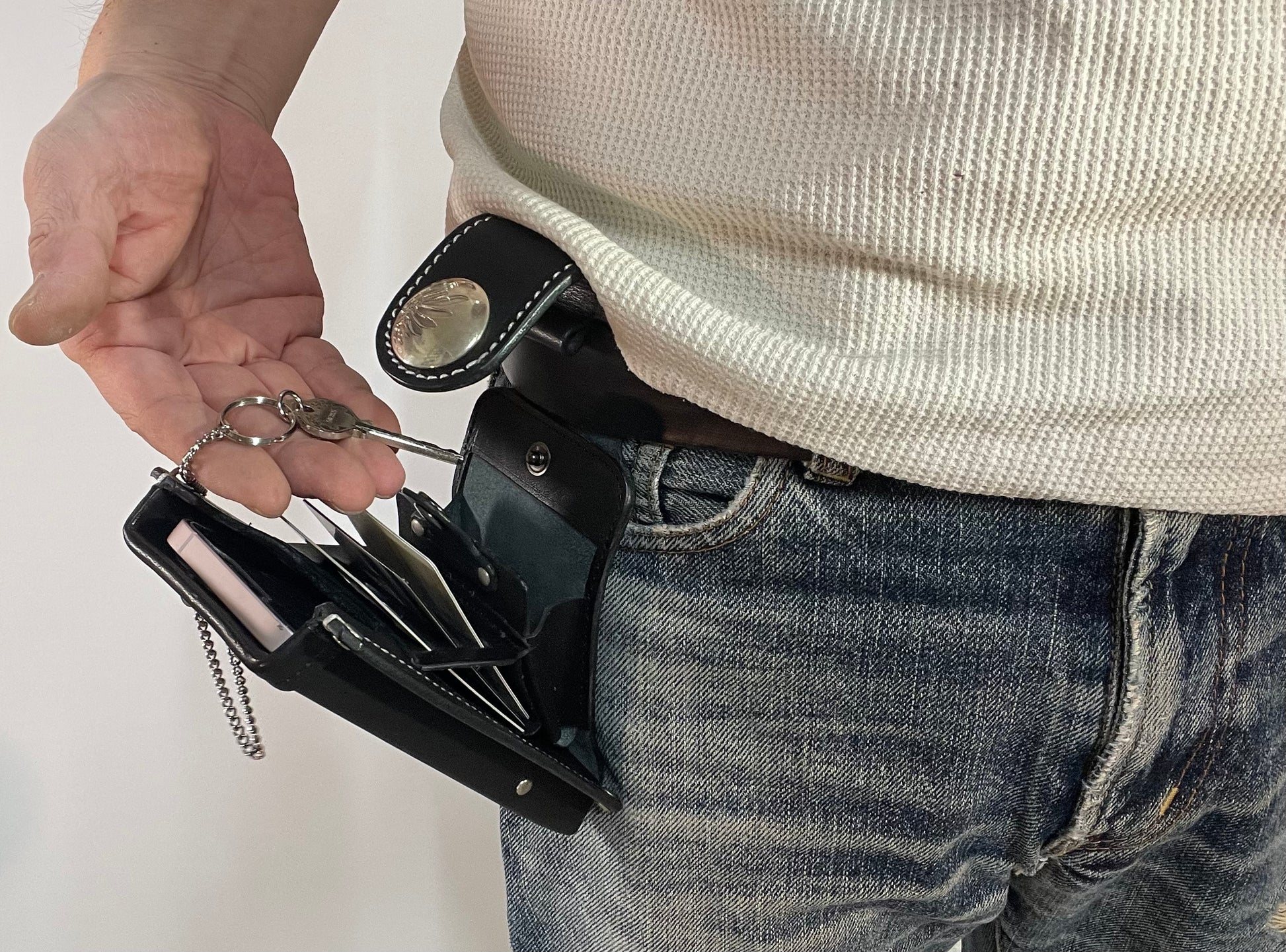 メインのスマホポケットの他にカードホルダー、マルチポケットを装備することでキャッシュレ生活をスマートにサポートします。鍵などを繋げられるキーチェーンも付属。